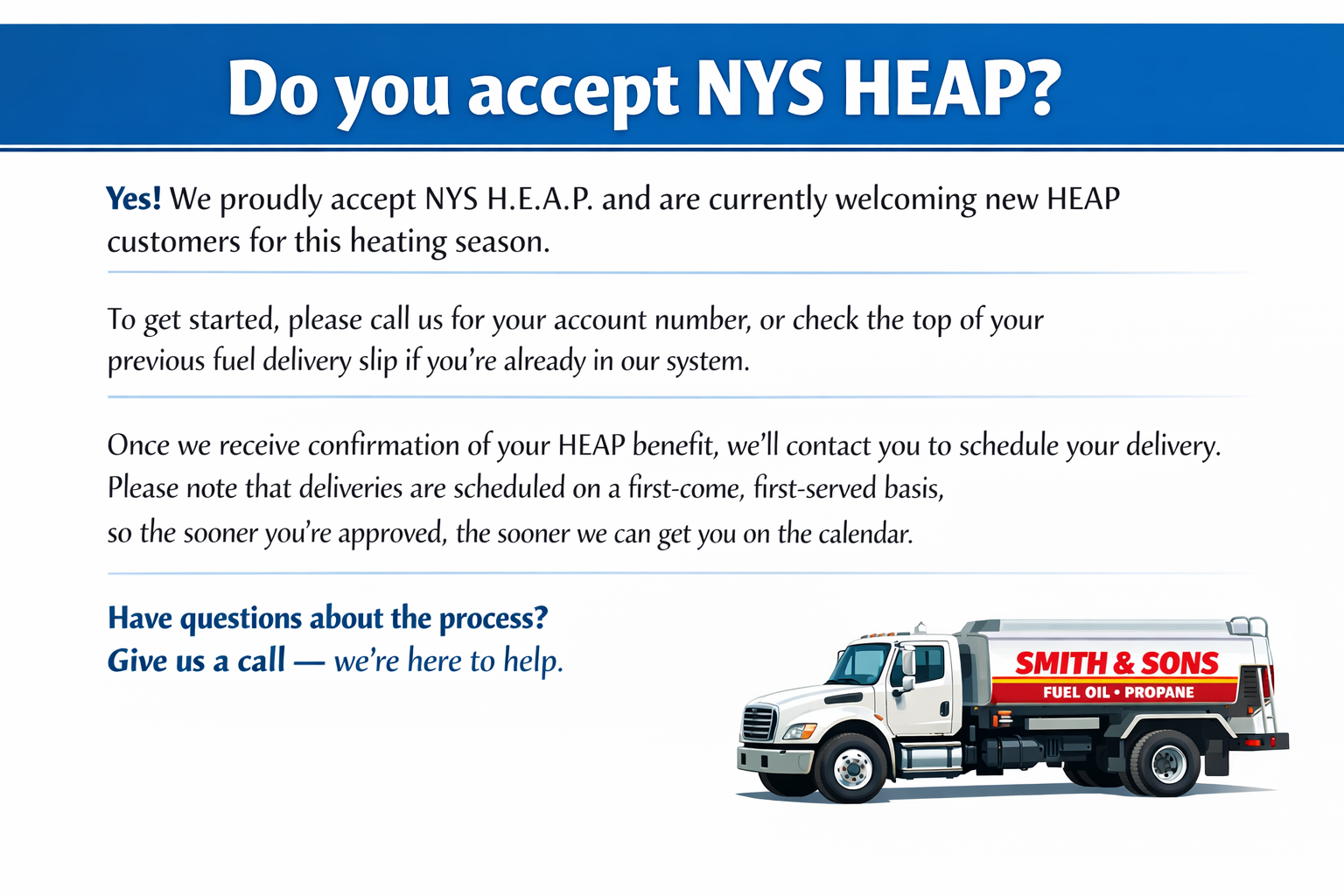 Regular H.E.A.P. benefits are issued between November 18th and March 19th. Keep in mind, while we often receive confirmation promptly, actual funds from the state may take weeks or months to arrive — this does not delay your delivery once confirmation is in hand.